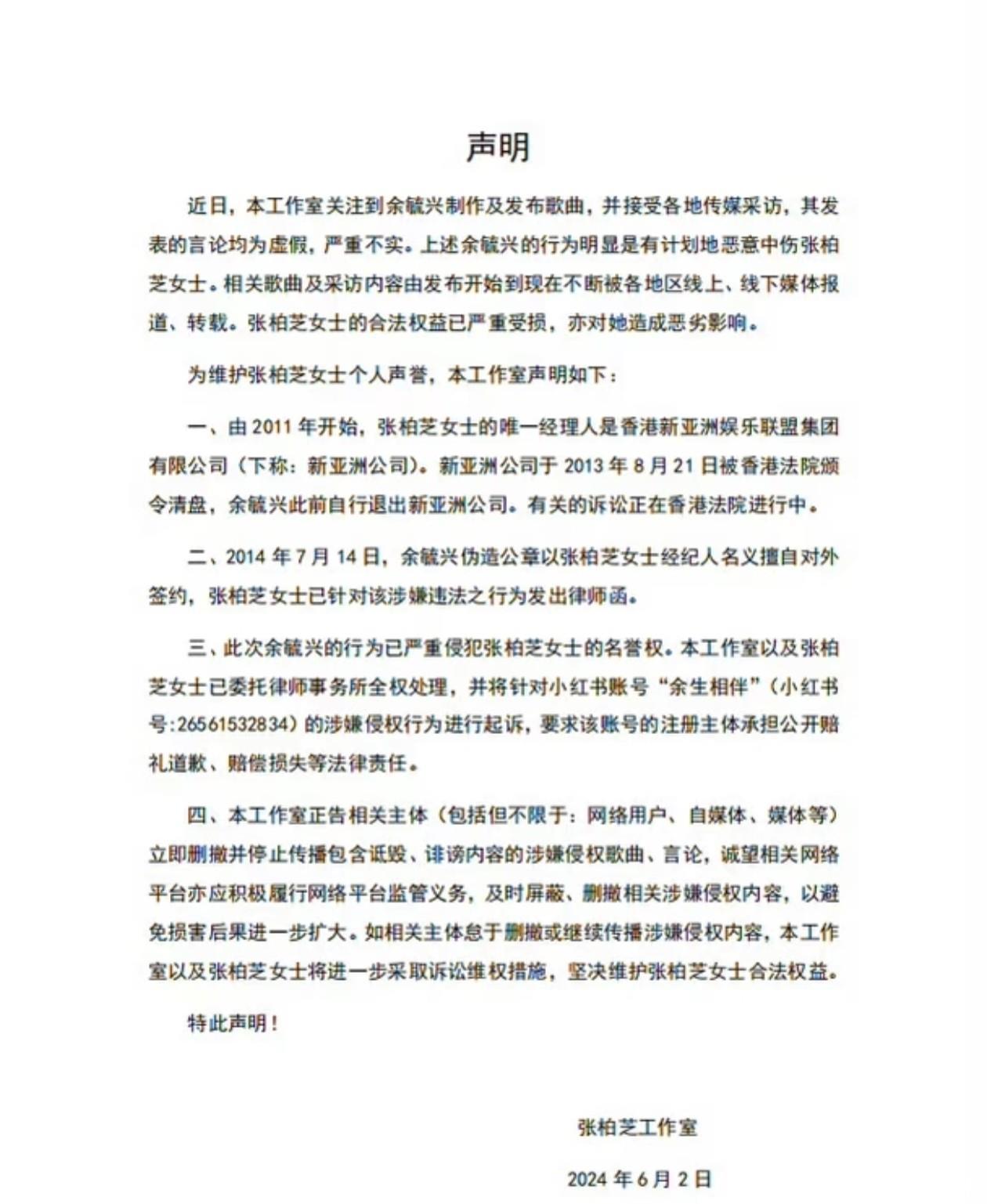 2020年7月,余毓兴起诉张柏芝,却被好友孙德荣怒呛“欠债不还玩消失”,明指其债务缠身,想借机坑一笔。2024年3月,余毓兴更是疯魔,做出了让人意想不到的一件事情——出歌diss张柏芝,张柏芝方发声明回应并且起诉。(我看着歌词都生气,写得不堪入目,超级过分)我把歌词放下图了。