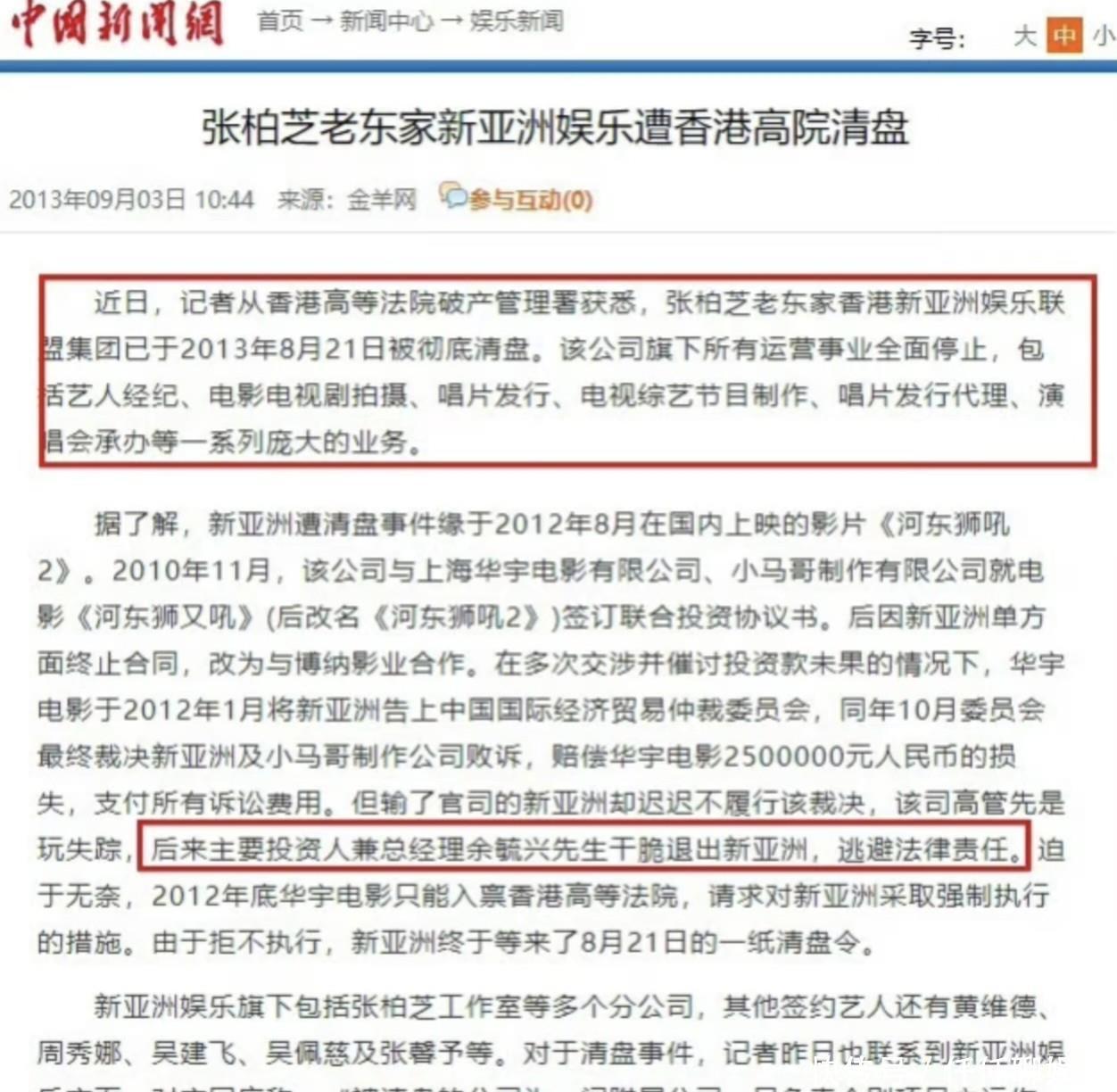 可实际情况是:经委托北京著名律师叶海波查明,余毓兴早已于2013年6月离开香港新亚洲娱乐公司,已不再是张柏芝的经纪人,但余毓兴仍以张柏芝经纪人身份,为张柏芝签订合同。