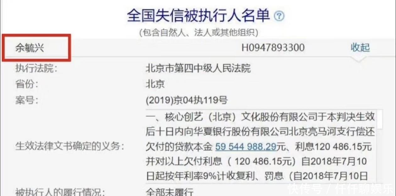 2019年9月25日,余毓兴被列入全国失信被执行人名单,认证老赖,本金加利息要付6000多万。