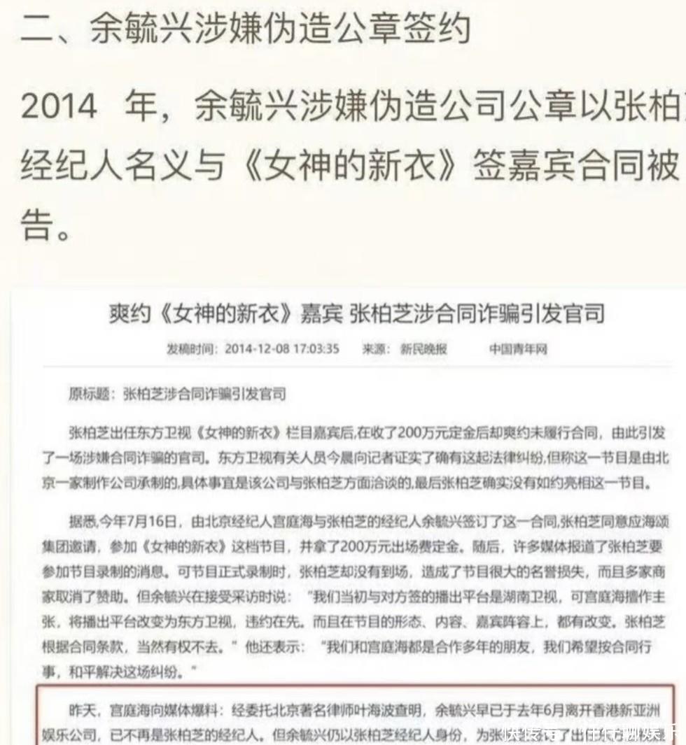 2014年7月 14日,余毓兴伪造公章以张柏芝经纪人的身份擅自对外签约综艺节目《女神的新衣》并拿了200万出场费,导致当时张柏芝被全网辱骂耍大牌,当时的新闻标题写的都是《爽约‘女神的新衣’嘉宾,张柏芝涉合同诈骗引发官司》。